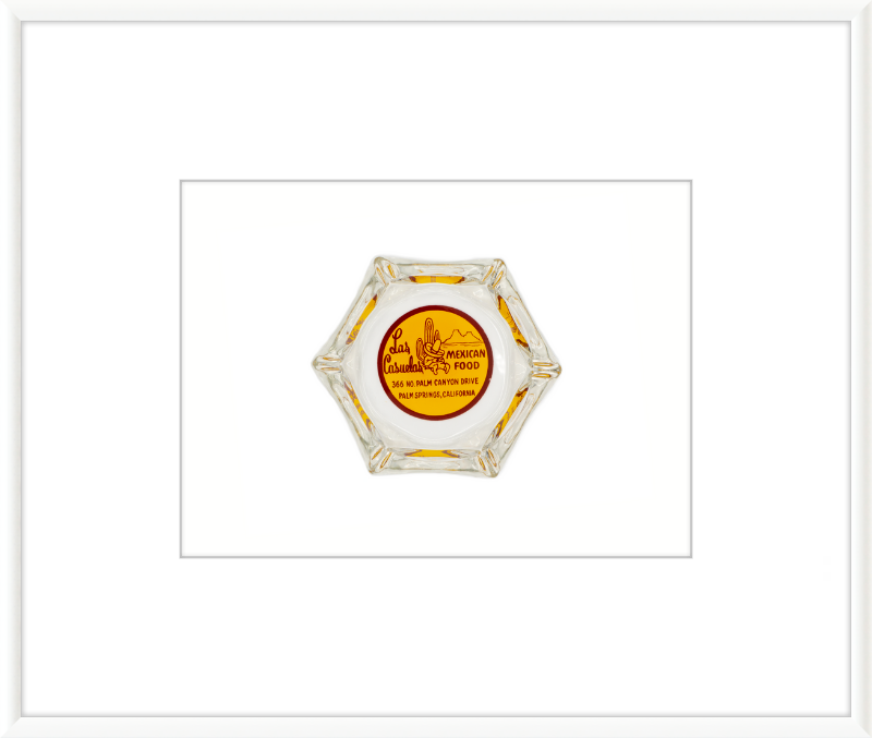 A high quality art print of an ashtray from Las Casuelas Mexican Food, Palm Springs, California. Vintage, circa 1960s. Framed in 3/8" extruded aluminum metal. Made in the USA.
