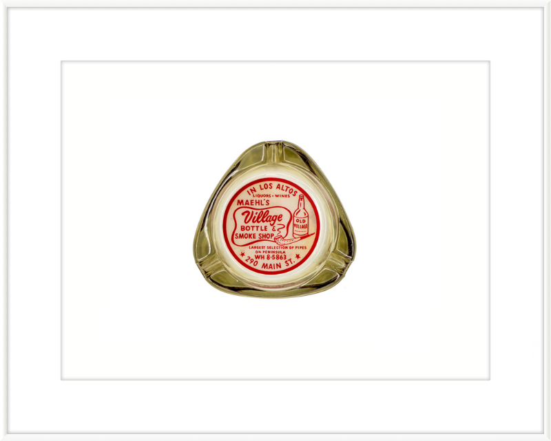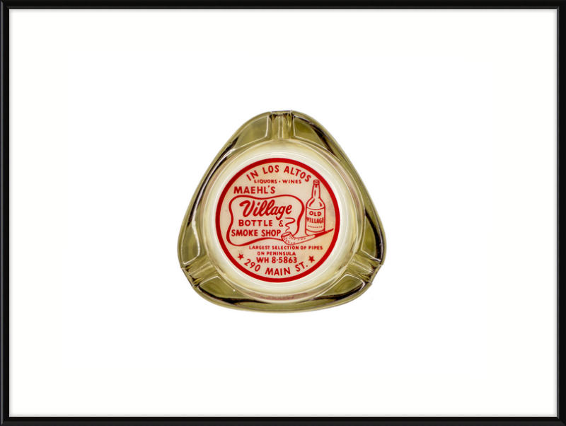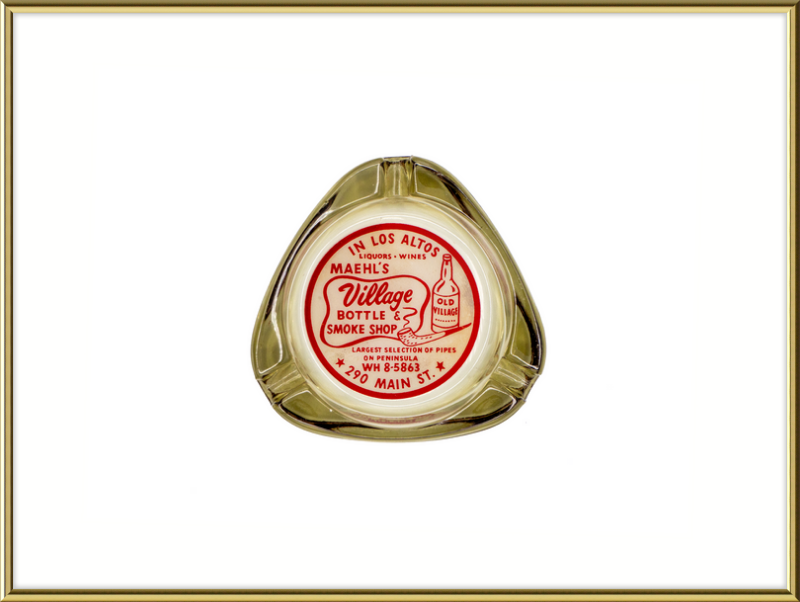A high quality art print of an ashtray from Maehl's Village Bottle & Smoke Shop, Los Altos, California. Vintage, circa 1950s. Framed in 3/8" extruded aluminum metal. Made in the USA.