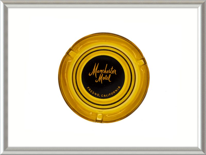 A high quality art print of an ashtray from the Manchester Motel, Fresno, California. Vintage, circa 1950s or 1960s. Framed in 3/8" extruded aluminum metal. Made in the USA.