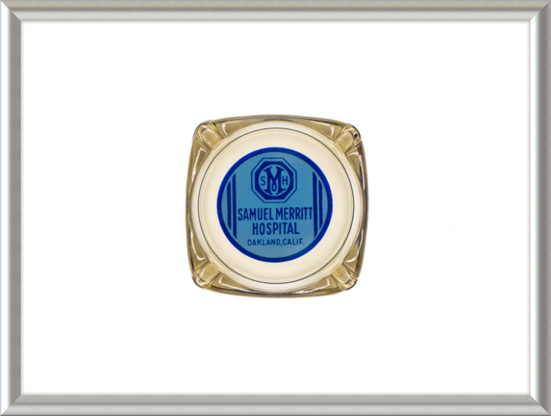 A high quality art print of an ashtray from the Samuel Merritt Hospital, Oakland, California. Vintage, circa 1950s or 1960s. Framed in 3/8" extruded aluminum metal. Made in the USA.