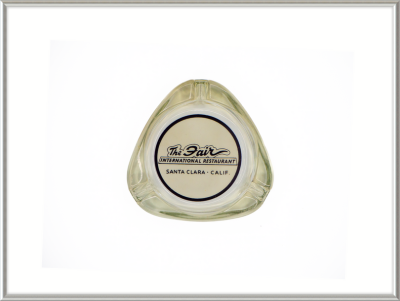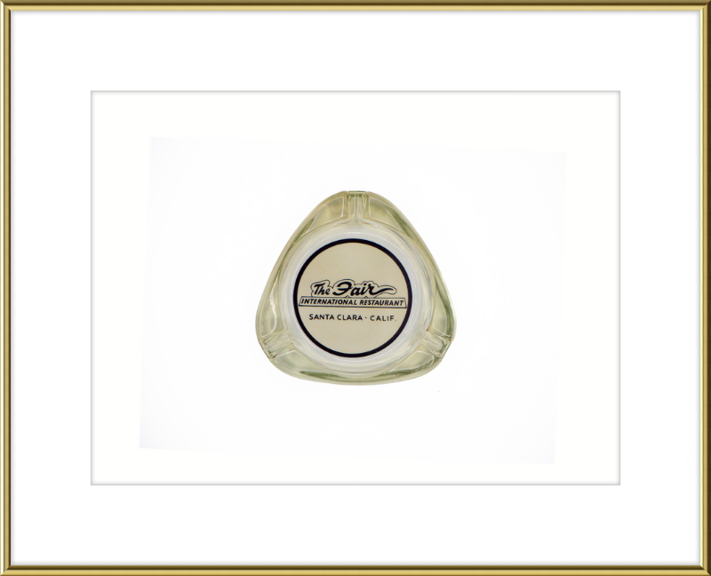 A high quality art print of an ashtray from The Fair International Restaurant, Santa Clara, California. Vintage, circa 1950s or 1960s. Framed in 3/8" extruded aluminum metal. Made in the USA.