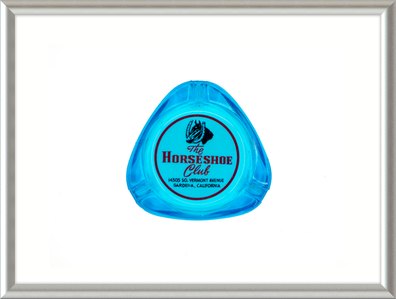 A high quality art print of an ashtray from The Horseshoe Club, Gardena, California. Vintage, circa 1960s. Framed in 3/8" extruded aluminum metal. Made in the USA.